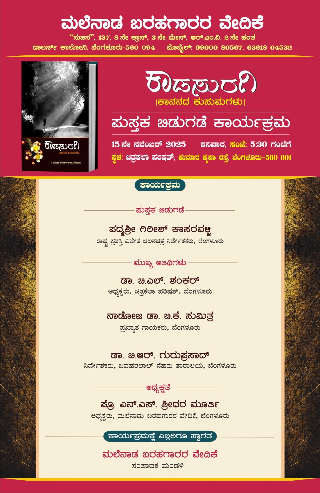 ನವಂಬರ್ 15ರಂದು ಶನಿವಾರ ಮಲೆನಾಡ ಬರಹಗಾರರ ವೇದಿಕೆಯಿಂದ ʼಕಾಡ ಸುರಗಿʼ ಪುಸ್ತಕ ಬಿಡುಗಡೆ