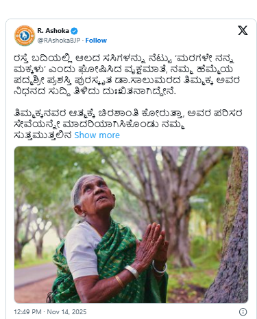 ಬೆಂಗಳೂರು: ತಮ್ಮ ಅಸಾಮಾನ್ಯ ಪರಿಸರ ಪ್ರೀತಿ ಮತ್ತು ಸಾವಿರಾರು ಮರಗಳನ್ನು ಬೆಳೆಸಿದ ಸಾಧನೆಯಿಂದಾಗಿ 'ವೃಕ್ಷಮಾತೆ' ಎಂದೇ ವಿಶ್ವದಾದ್ಯಂತ ಖ್ಯಾತಿ ಗಳಿಸಿದ್ದ ಸಾಲುಮರದ ತಿಮ್ಮಕ್ಕ ಅವರು ಶುಕ್ರವಾರ, ನವೆಂಬರ್ 14, 2025 ರಂದು ವಿಧಿವಶರಾಗಿದ್ದಾರೆ. ಅವರಿಗೆ 114 ವರ್ಷ ವಯಸ್ಸಾಗಿತ್ತು.