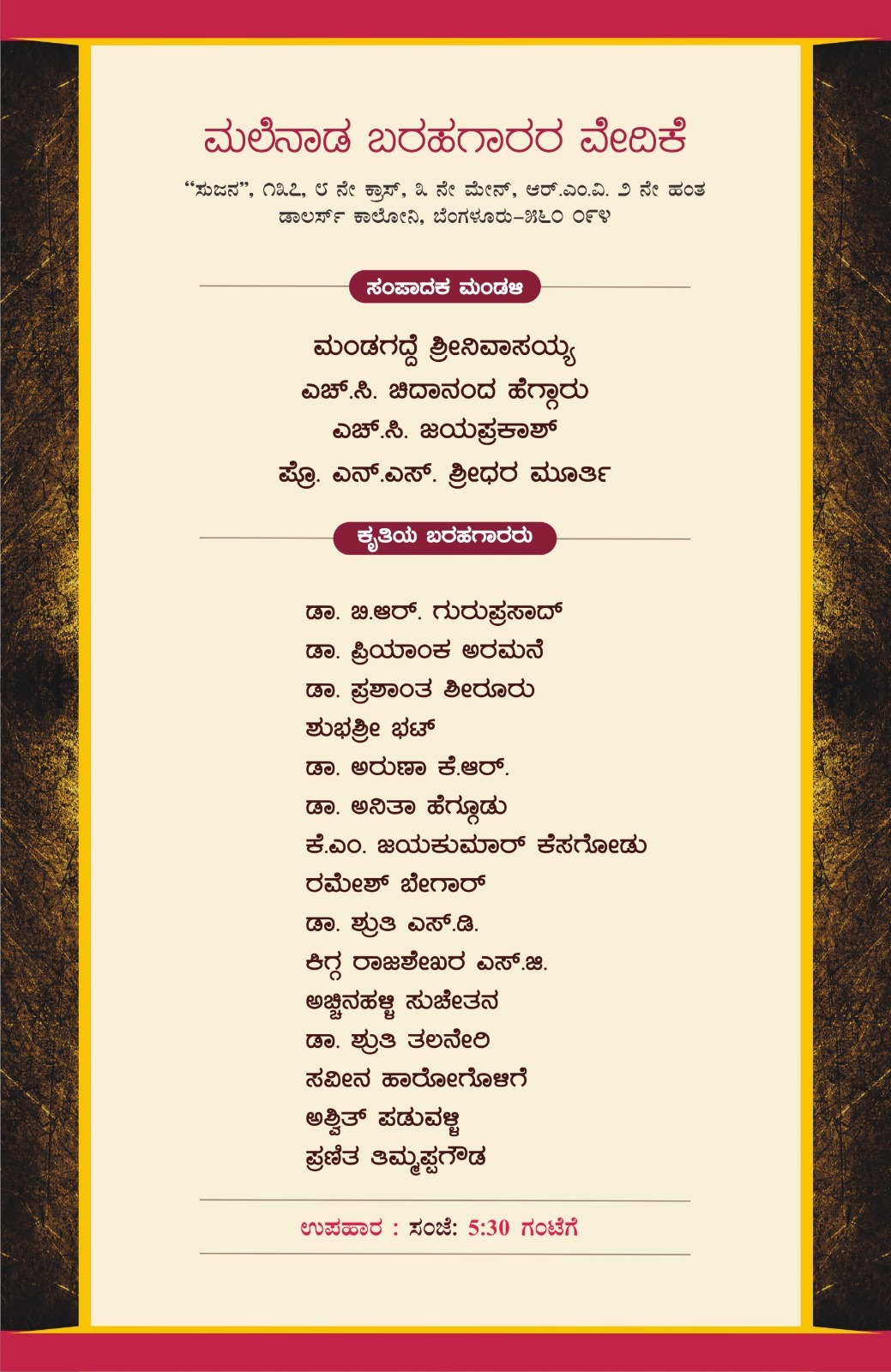 ಒಟ್ಟು ಹದಿನೆಂಟು ಲೇಖಕರ ಲೇಖನಗಳ ಕೃತಿಯನ್ನು ಮಂಡಗದ್ದೆ ಶ್ರೀನಿವಾಸಯ್ಯ, ಎಚ್.ಸಿ.ಚಿದಾನಂದ ಹೆಗ್ಗಾರು,ಎಚ್.ಸಿ.ಜಯಪ್ರಕಾಶ್ ಮತ್ತು ಎನ್.ಎಸ್.ಶ್ರೀಧರ ಮೂರ್ತಿಯವರನ್ನುಳ್ಳ ಸಂಪಾದಕ ಮಂಡಳಿ ಸಂಪಾದಿಸಿದ್ದು ಸಾಂಸ್ಕೃತಿಕ ಮಹತ್ವದ ಈ ಕಾರ್ಯಕ್ರಮ ಜರುಗಲಿದೆ ಎಂದು ಮಲೆನಾಡು ಬರಹಗಾರರ ವೇದಿಕೆಯ ಪರವಾಗಿ ಸಂಚಾಲಕರಾದ ಎಚ್.ಸಿ.ಜಯಪ್ರಕಾಶ್ ಪ್ರಕಟಣೆಯಲ್ಲಿ ತಿಳಿಸಿದ್ದಿದ್ದಾರೆ.